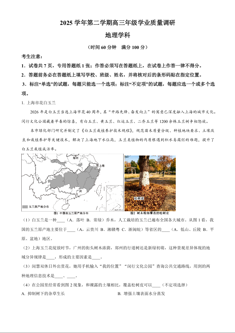 高三地理(解析版)--上海市闵行区2026届高三下学期二模