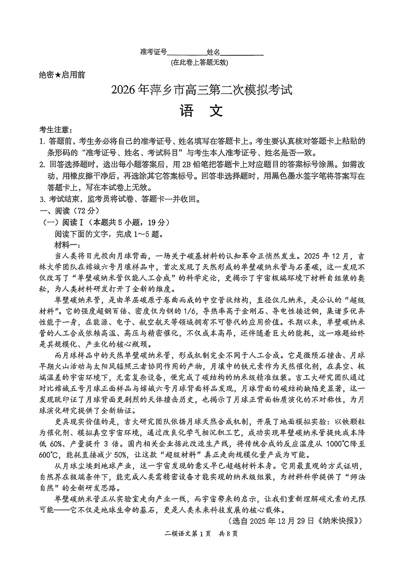 高三语文--江西省萍乡市2026届高三第二次模拟考试(萍乡二模)