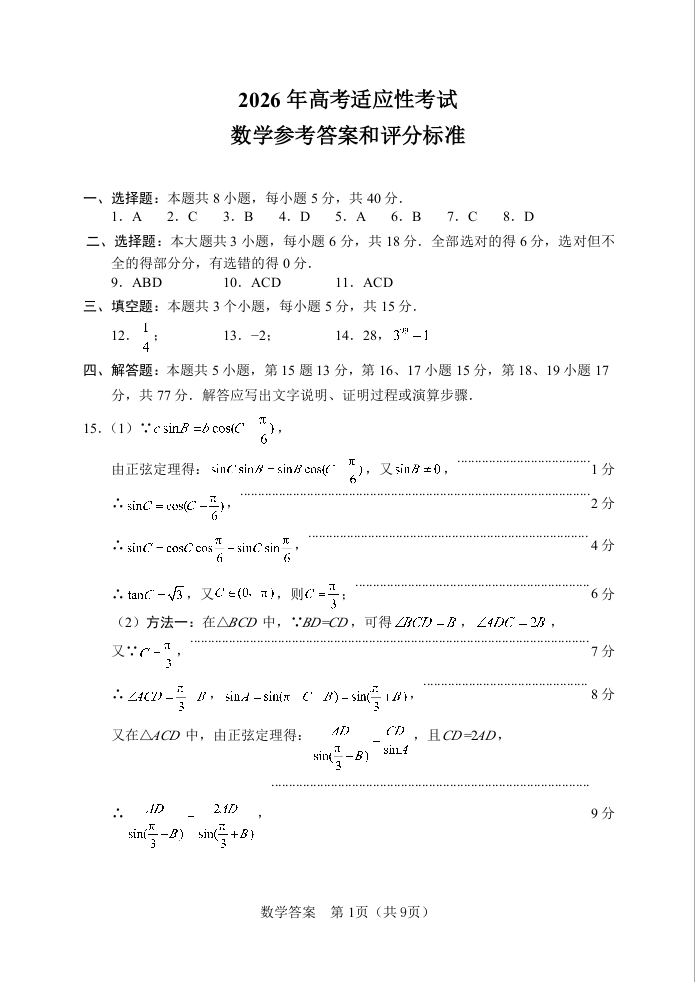 高三数学答案--四川省绵阳市高中2023级(2026届)高三第三次诊断性考试(绵阳三诊)
