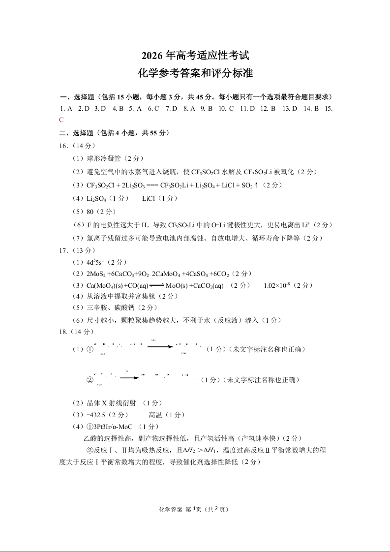 高三化学答案--四川省绵阳市高中2023级(2026届)高三第三次诊断性考试(绵阳三诊)