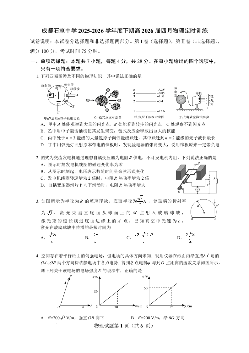 高三物理--四川省成都石室中学2026届高三4月专项训练
