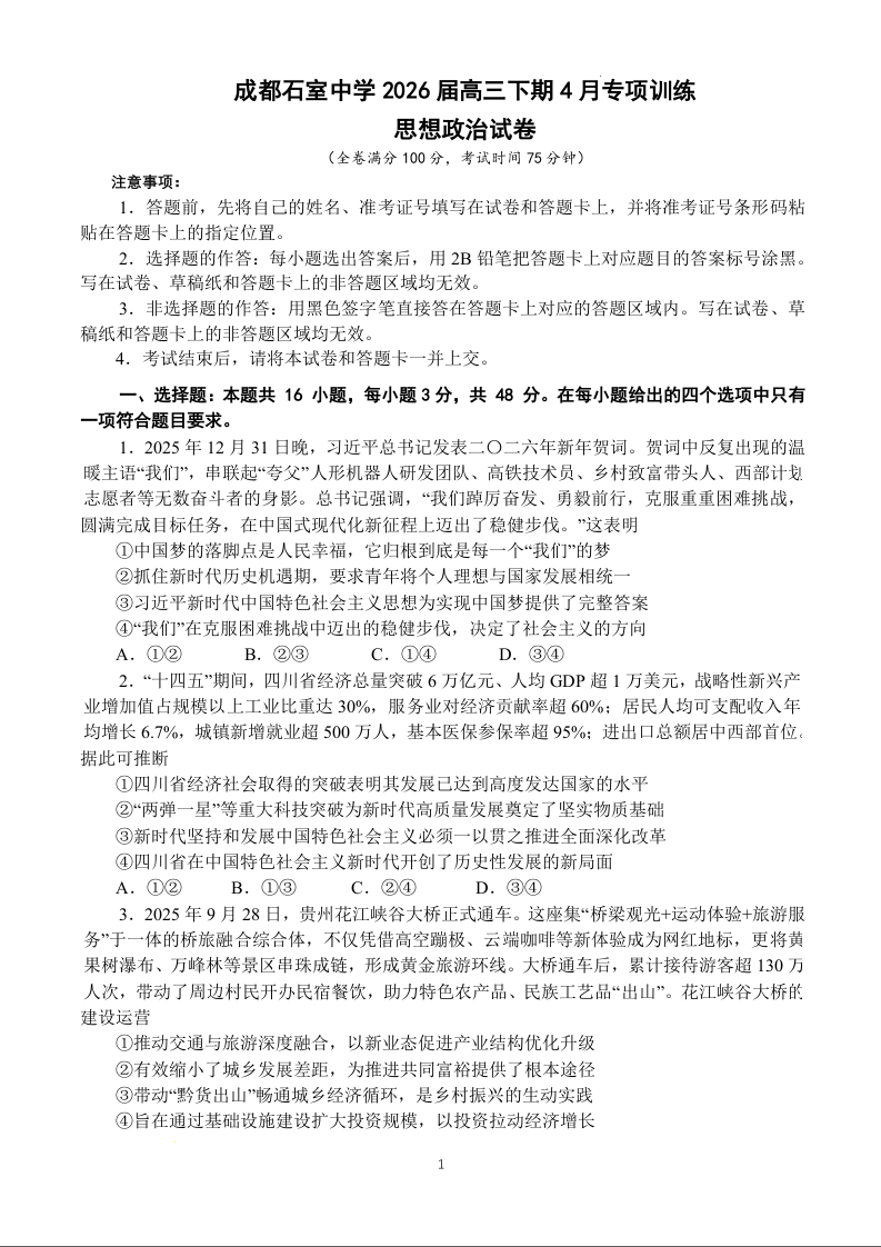 高三政治--四川省成都石室中学2026届高三4月专项训练