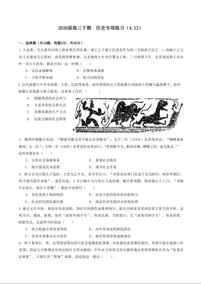 高三历史--四川省成都石室中学2026届高三4月专项训练