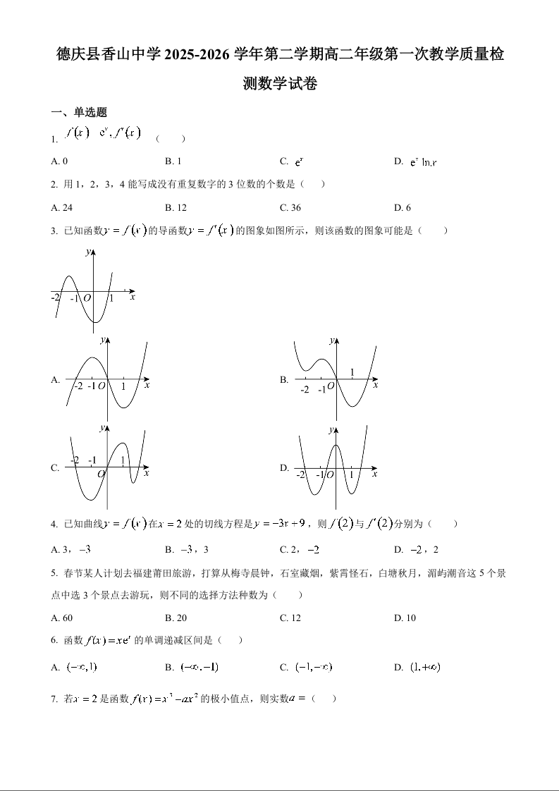 高二数学(原卷版)--广东省肇庆市重点校2025-2026学年高二下学期4月期中考试