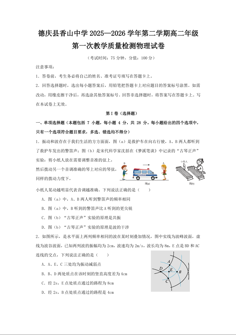 高二物理--广东省肇庆市重点校2025-2026学年高二下学期4月期中考试