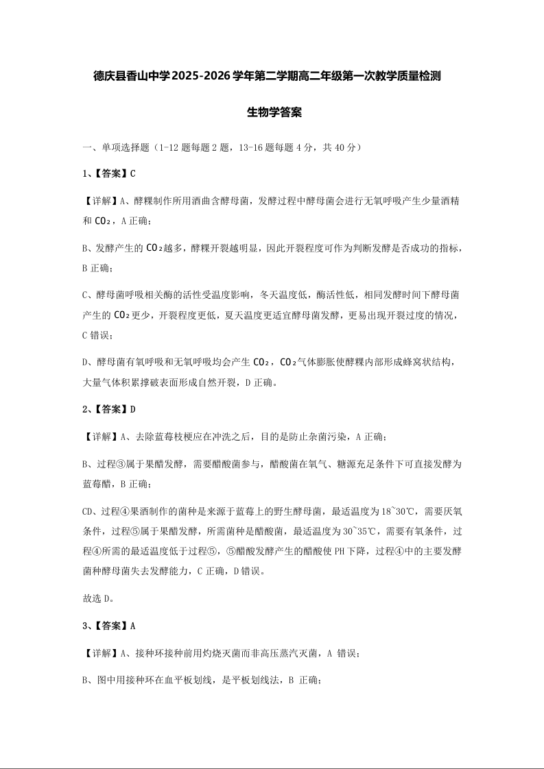 高二生物答案--广东省肇庆市重点校2025-2026学年高二下学期4月期中考试