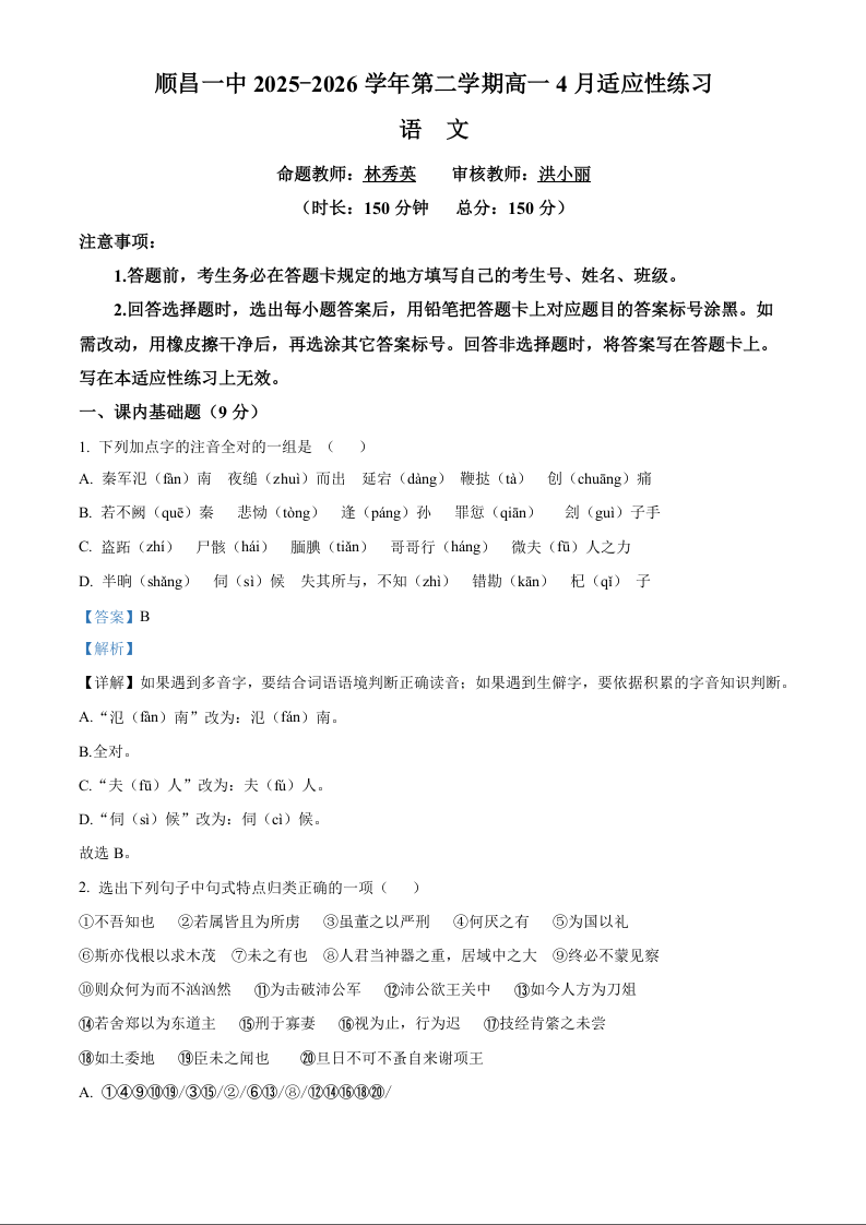 高一语文(解析版)--福建省南平市重点学校2025-2026学年高一下学期4月适应性练习