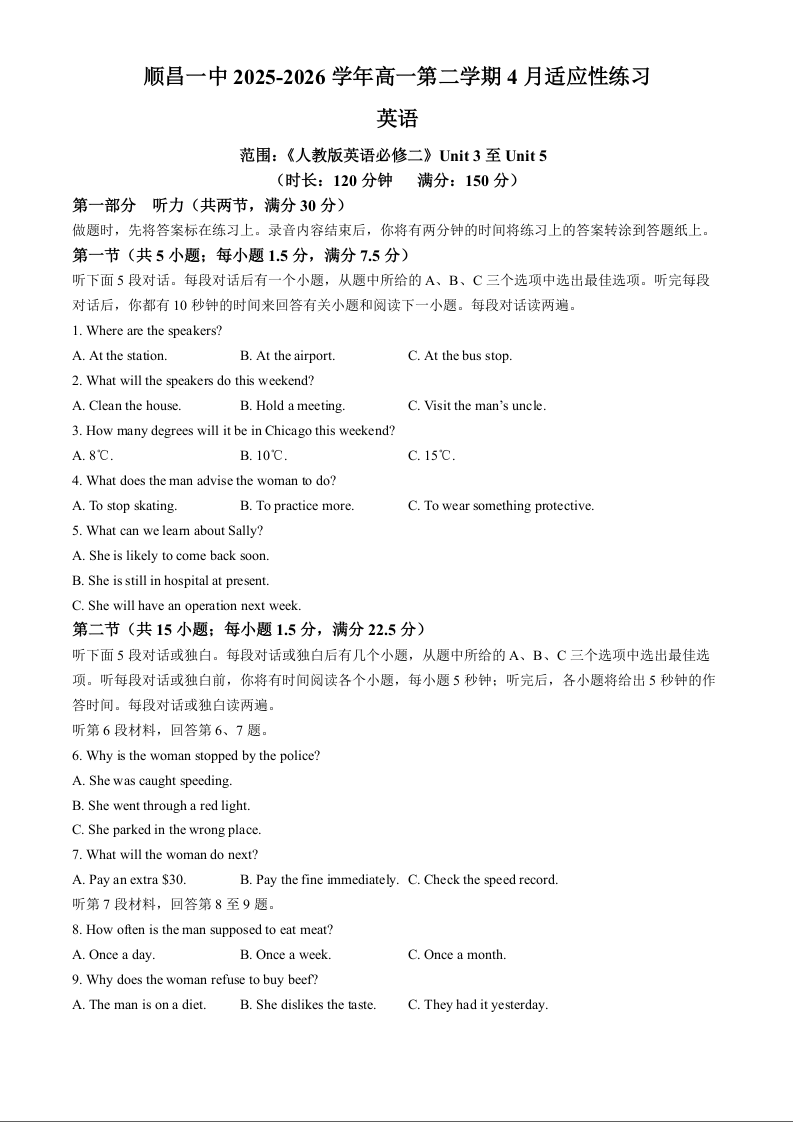 高一英语+答案--福建省南平市重点学校2025-2026学年高一下学期4月适应性练习