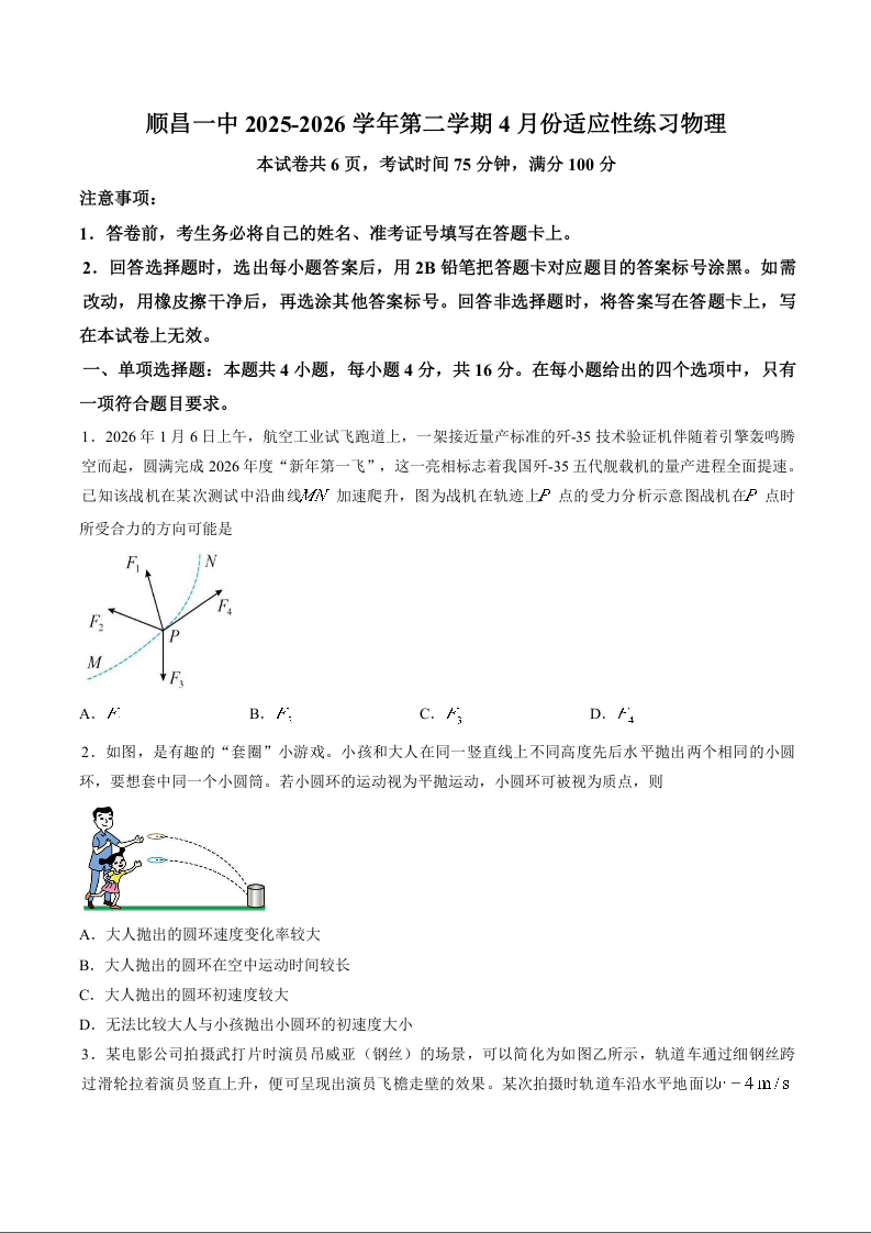 高一物理--福建省南平市重点学校2025-2026学年高一下学期4月适应性练习
