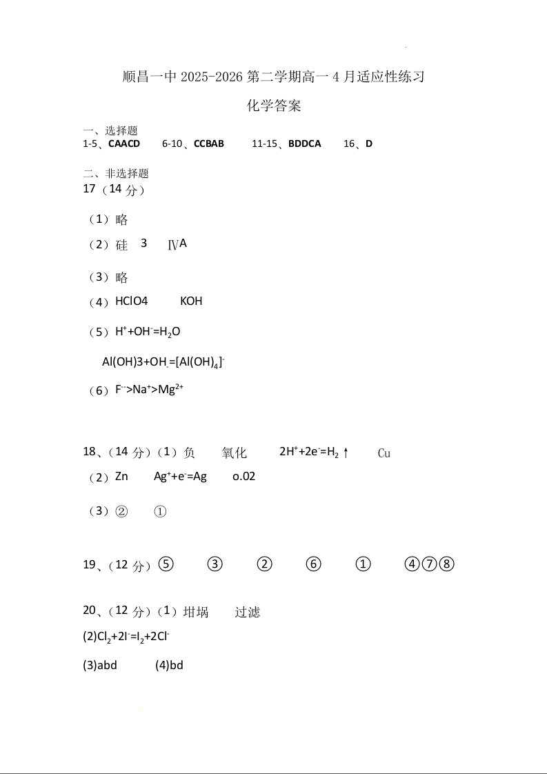 高一化学答案--福建省南平市重点学校2025-2026学年高一下学期4月适应性练习
