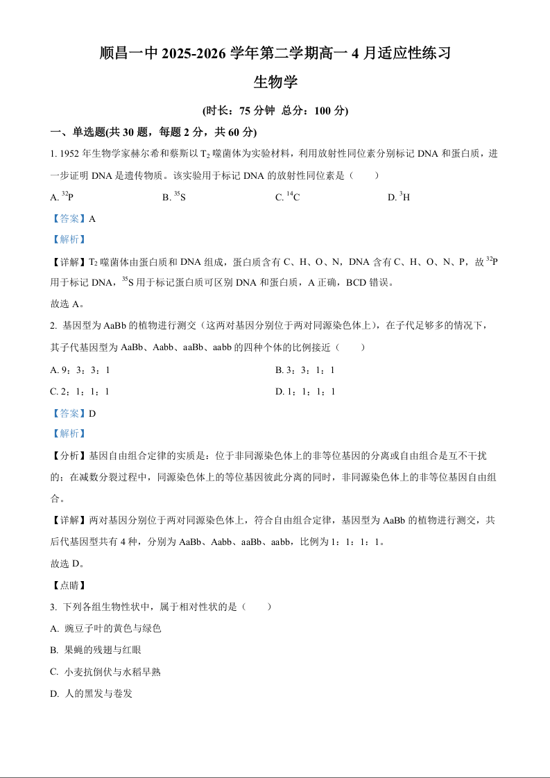 高一生物学(解析版)--福建省南平市重点学校2025-2026学年高一下学期4月适应性练习