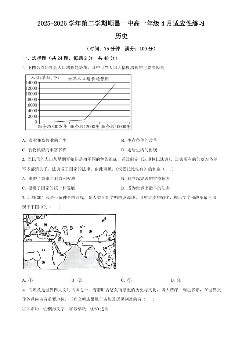 高一历史(原卷版)--福建省南平市重点学校2025-2026学年高一下学期4月适应性练习