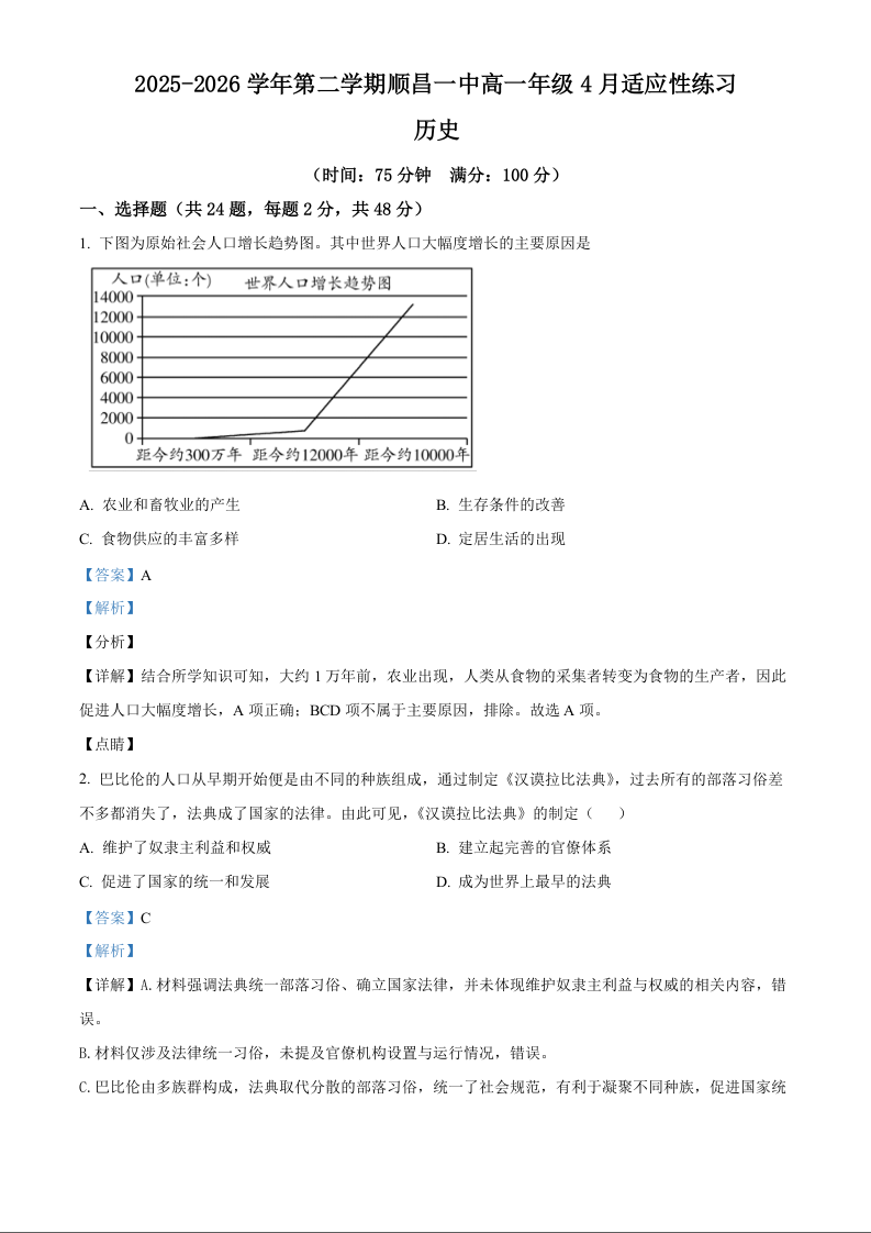 高一历史(解析版)--福建省南平市重点学校2025-2026学年高一下学期4月适应性练习