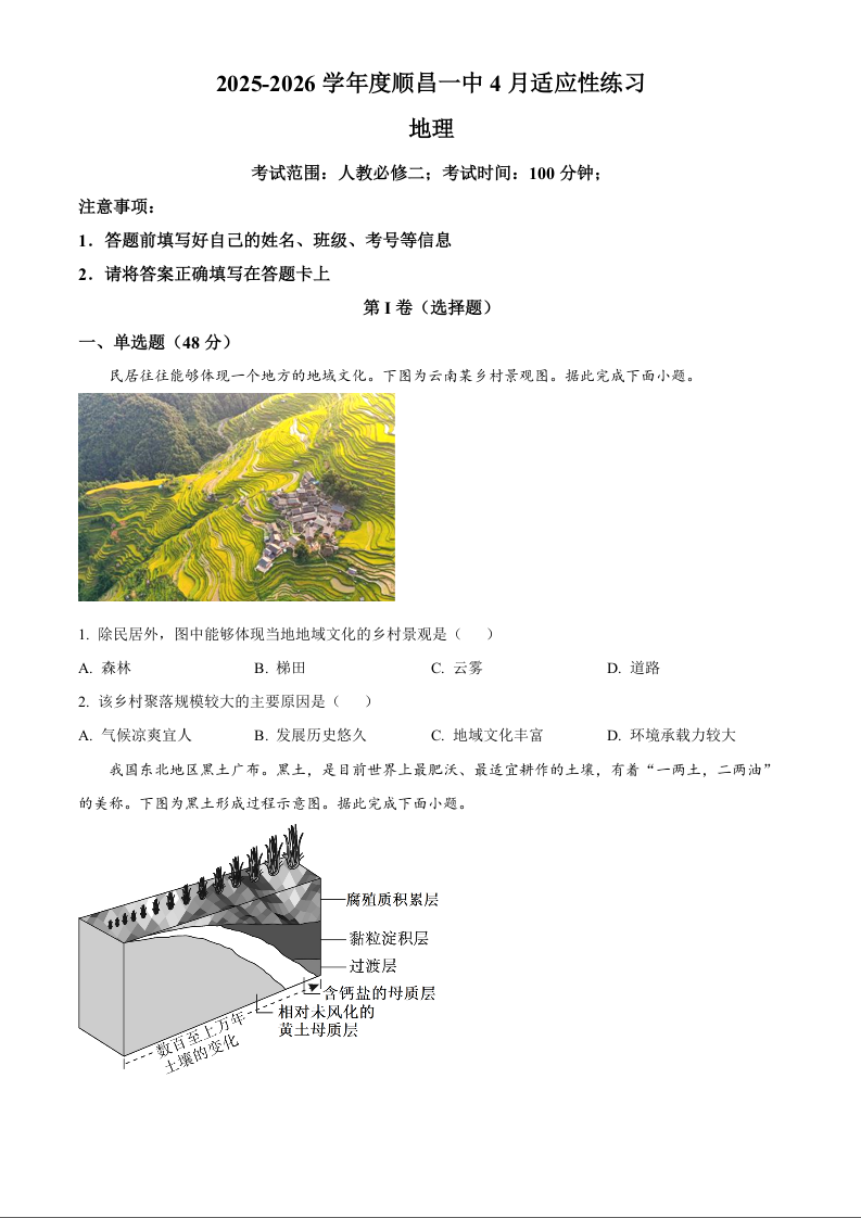 高一地理(原卷版)--福建省南平市重点学校2025-2026学年高一下学期4月适应性练习