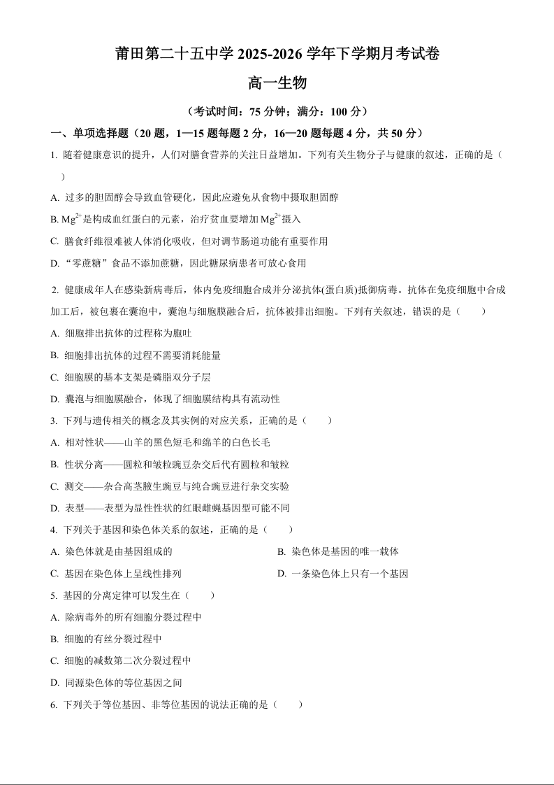高一生物(原卷版)--福建省莆田二十五中学2025-2026学年下学期4月月考