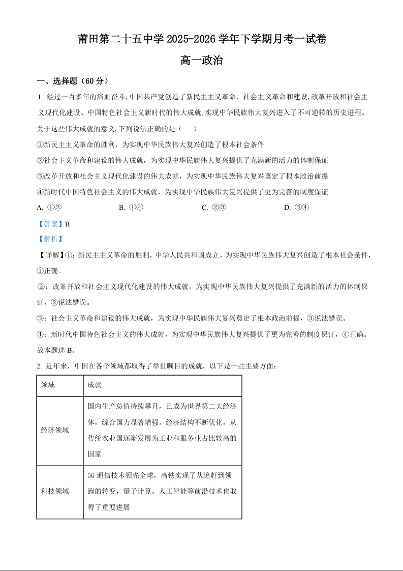 高一政治(解析版)--福建省莆田二十五中学2025-2026学年下学期4月月考