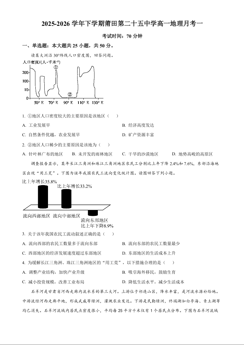 高一地理(原卷版)--福建省莆田二十五中学2025-2026学年下学期4月月考