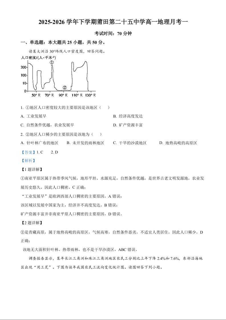 高一地理(解析版)--福建省莆田二十五中学2025-2026学年下学期4月月考