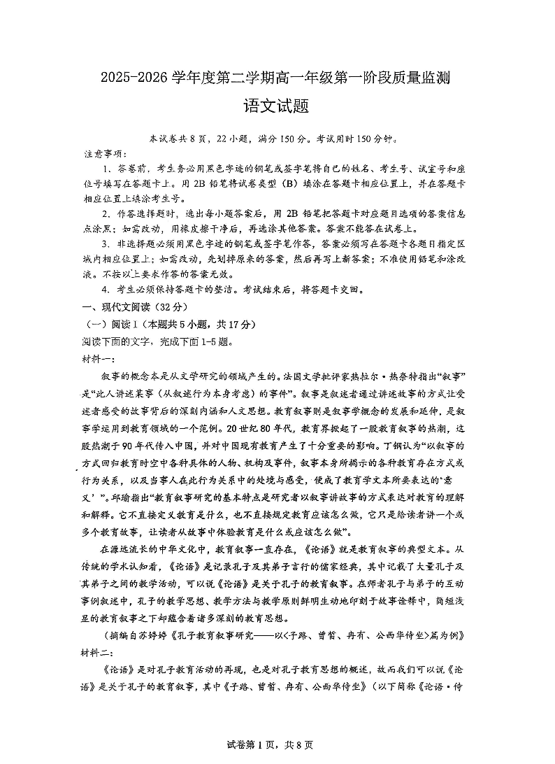 高一语文--广东省深圳市多校2025-2026学年高一下学期第一阶段质量监测联考