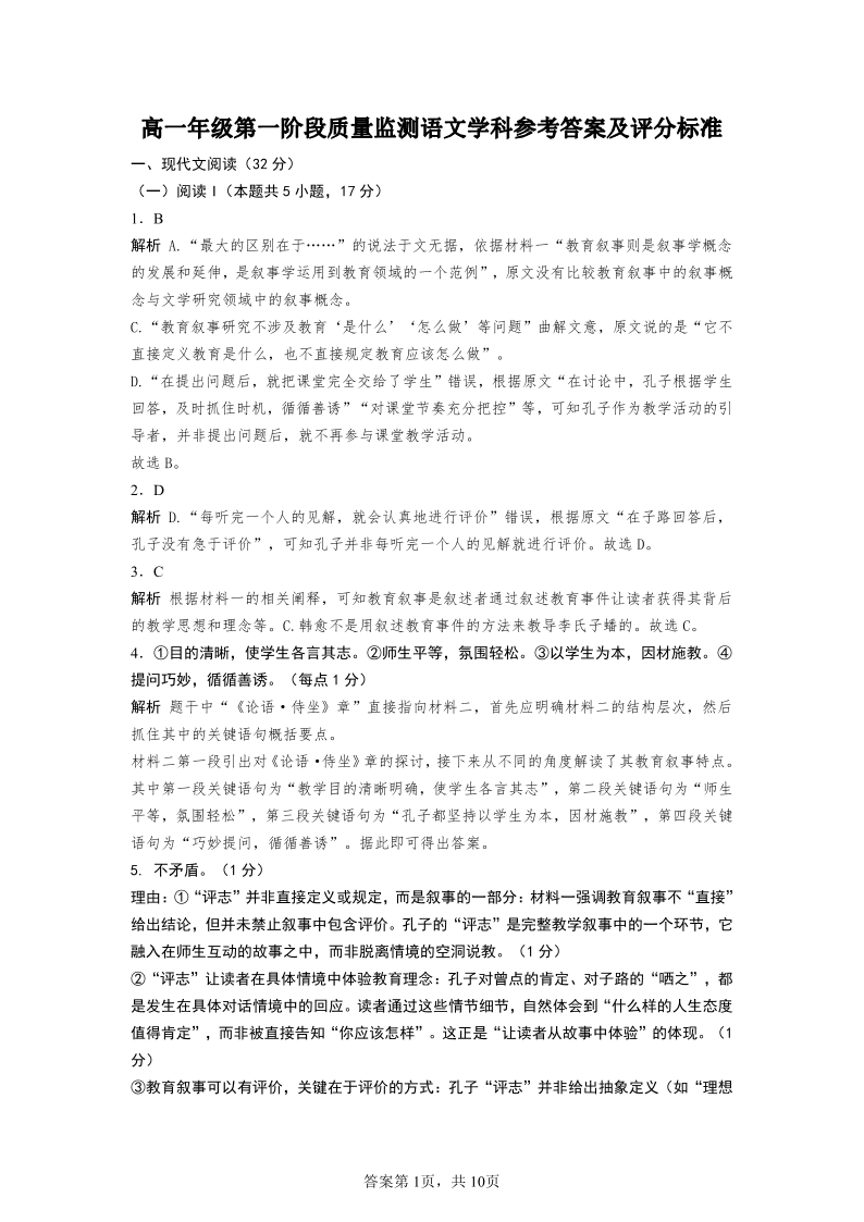 高一语文答案--广东省深圳市多校2025-2026学年高一下学期第一阶段质量监测联考