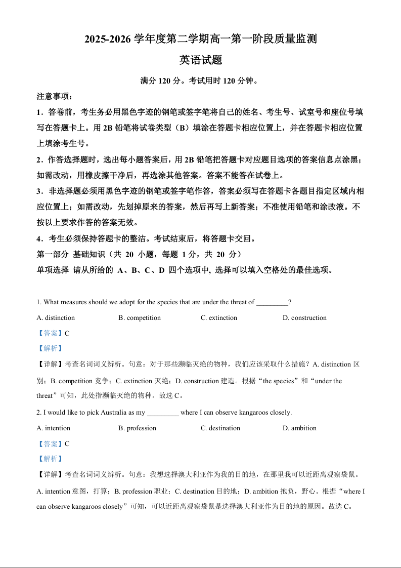 高一英语(解析版)--广东省深圳市多校2025-2026学年高一下学期第一阶段质量监测联考