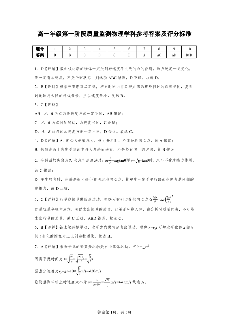 高一物理答案--广东省深圳市多校2025-2026学年高一下学期第一阶段质量监测联考