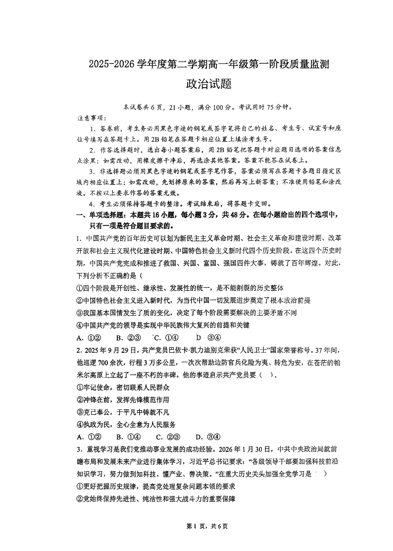 高一政治--广东省深圳市多校2025-2026学年高一下学期第一阶段质量监测联考