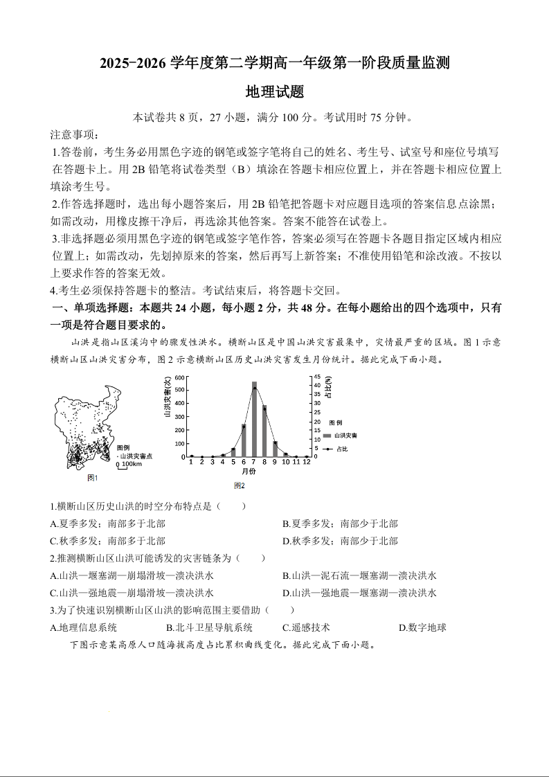高一地理+答案--广东省深圳市多校2025-2026学年高一下学期第一阶段质量监测联考