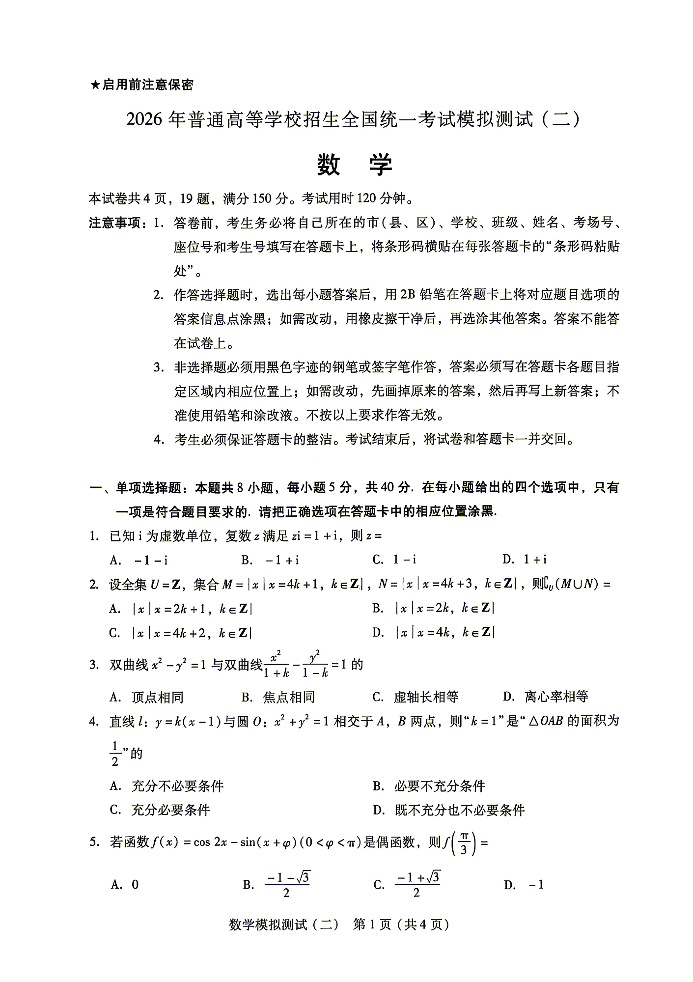 高三数学--广东省2026届高三下学期4月模拟测试(二)(广东二模)