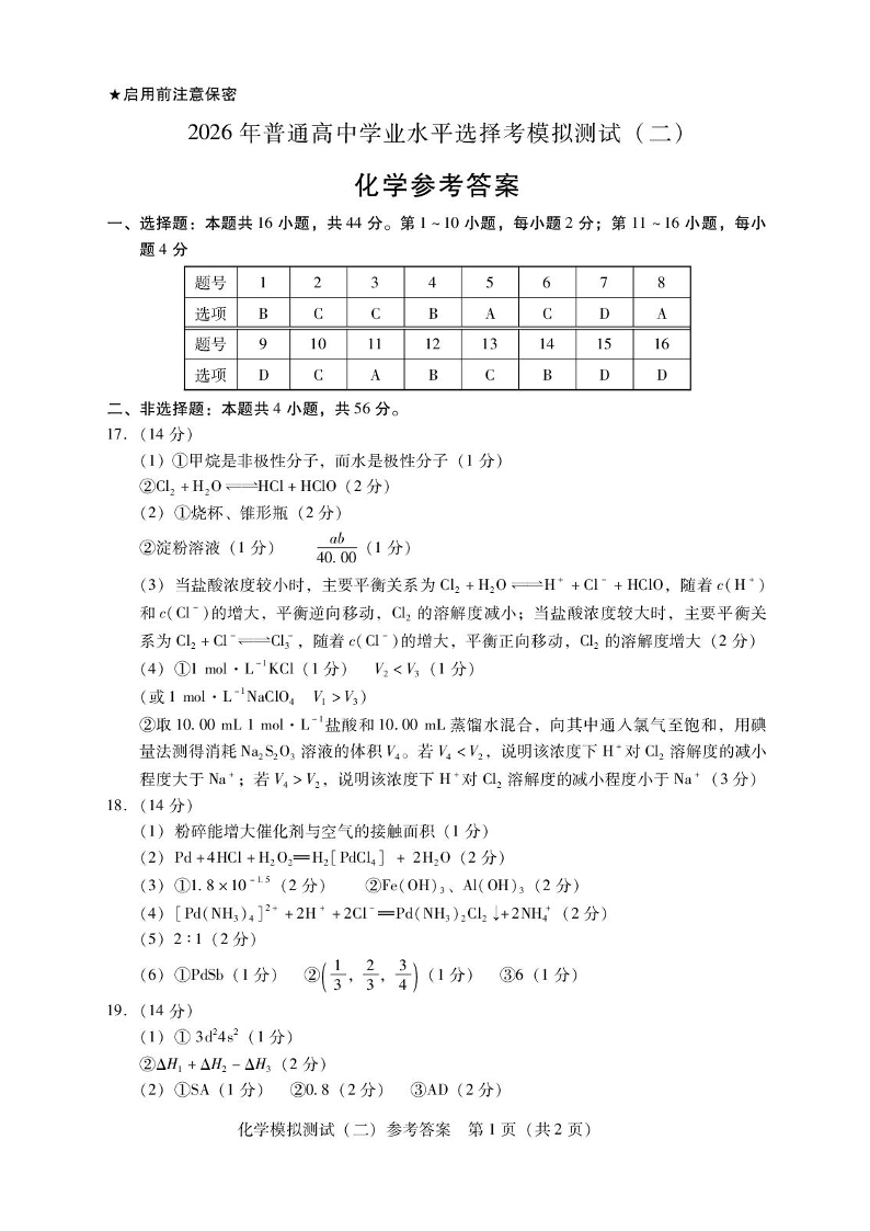 高三化学答案--广东省2026届高三下学期4月模拟测试(二)(广东二模)