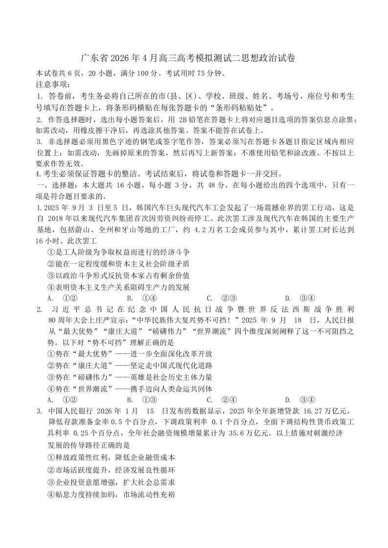 高三政治+答案--广东省2026届高三下学期4月模拟测试(二)(广东二模)