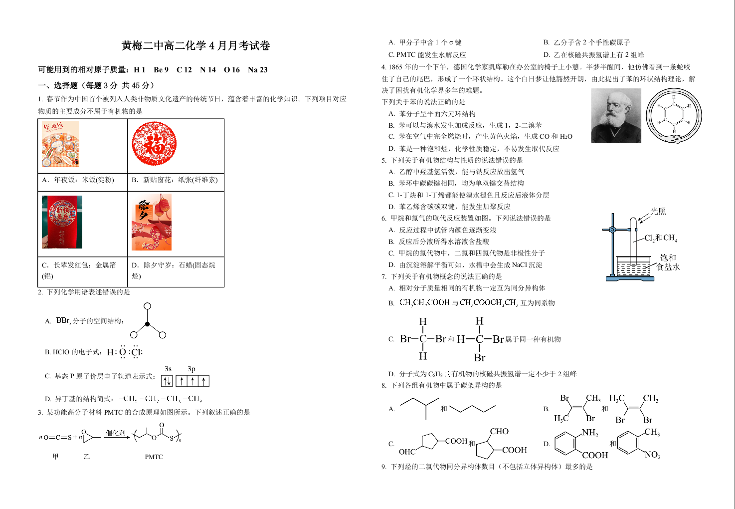 高三化学--湖北省黄冈市重点校2025-2026学年高二下学期4月月考