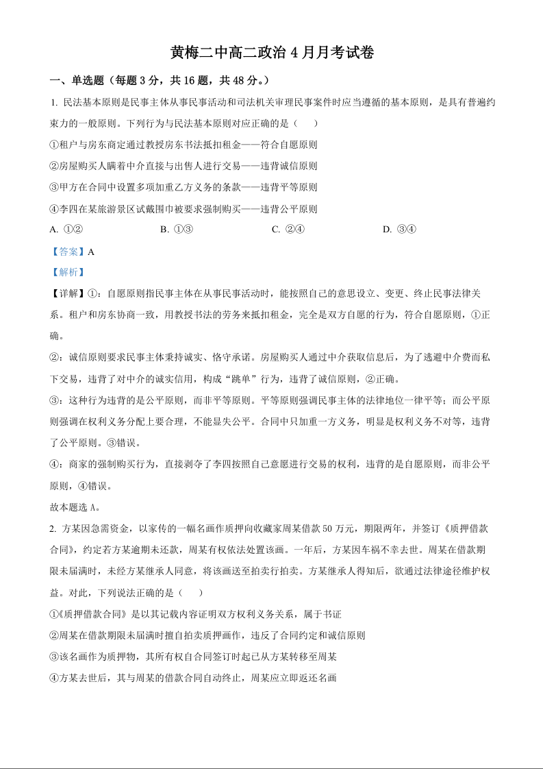 高三政治(解析版)--湖北省黄冈市重点校2025-2026学年高二下学期4月月考