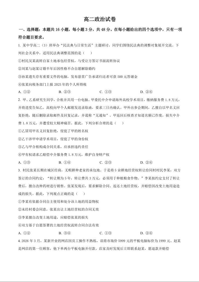 高二政治(原卷版)--湖北省武汉市洪山高级中学2025-2026学年高二下学期期中考试