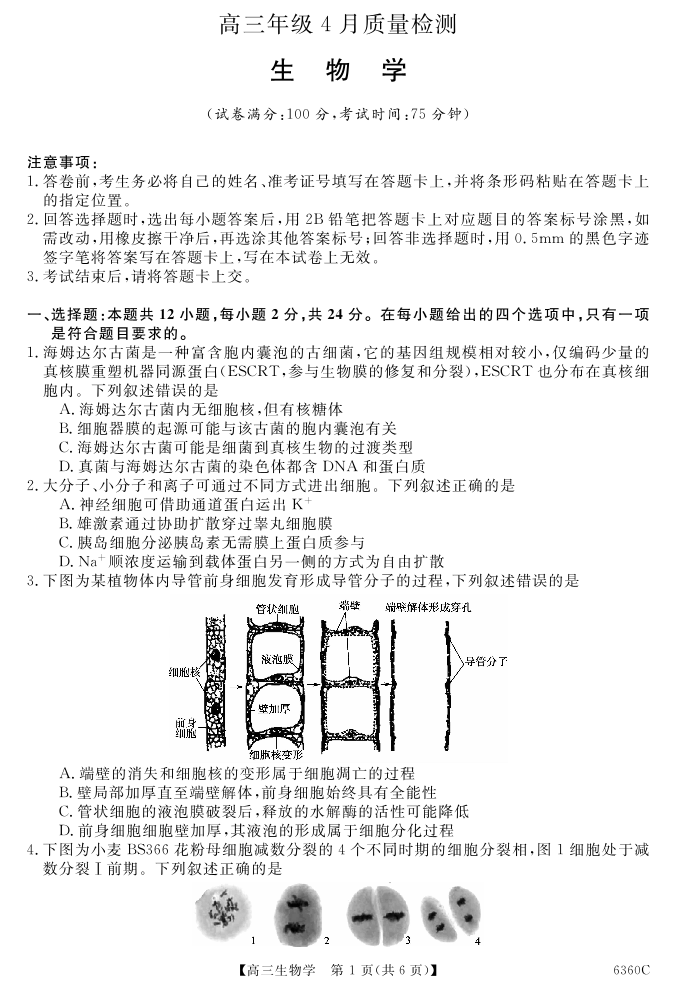 高三生物--湖南省天壹名校联盟2026届高三年级4月质量检测
