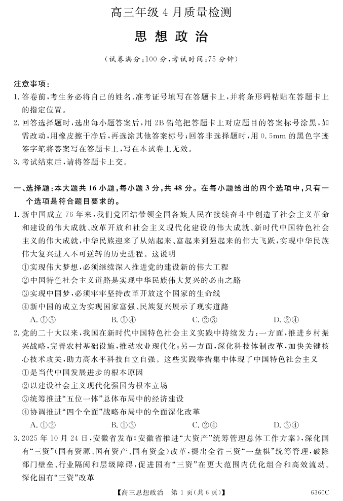 高三政治--湖南省天壹名校联盟2026届高三年级4月质量检测