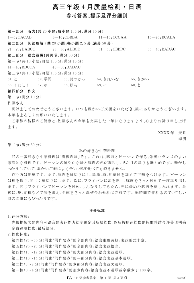 高三日语答案--湖南省天壹名校联盟2026届高三年级4月质量检测