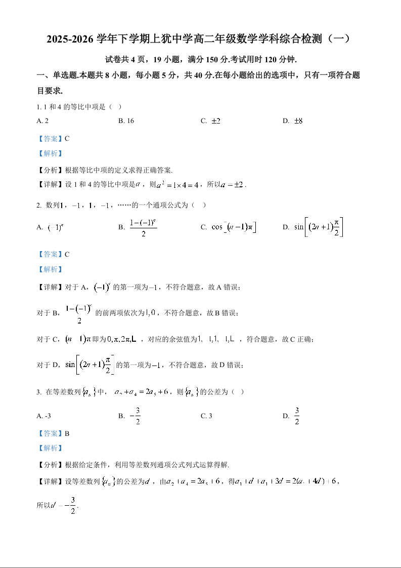 高二数学(解析版)--江西省赣州市四校2025-2026学年高二下学期综合检测联考(一)