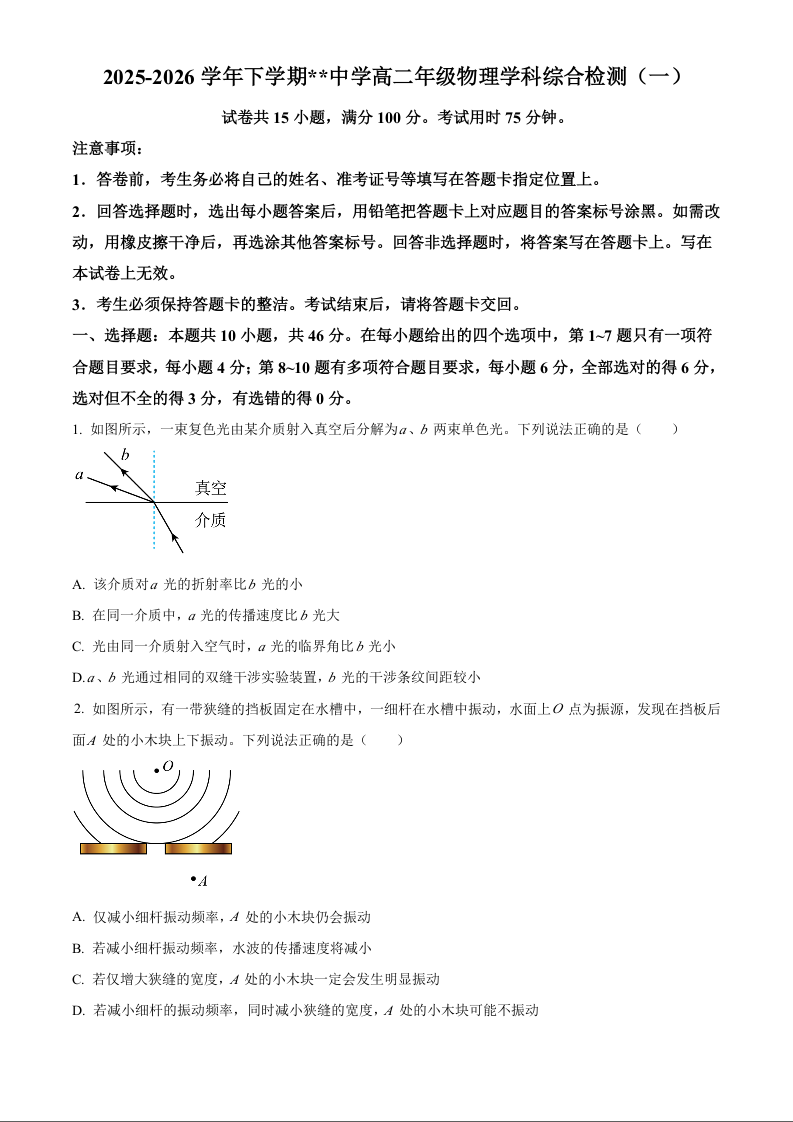 高二物理--江西省赣州市四校2025-2026学年高二下学期综合检测联考(一)