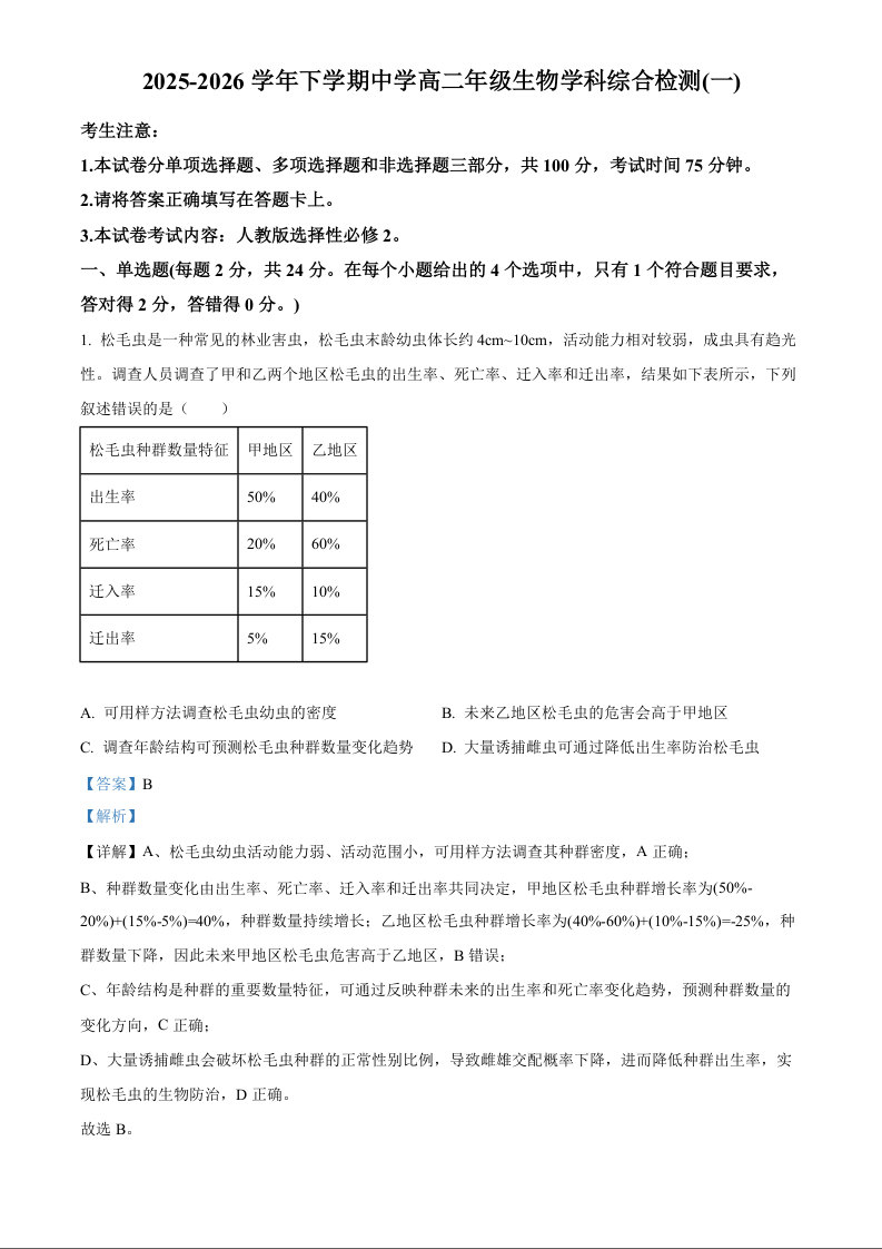 高二生物(解析版)--江西省赣州市四校2025-2026学年高二下学期综合检测联考(一)