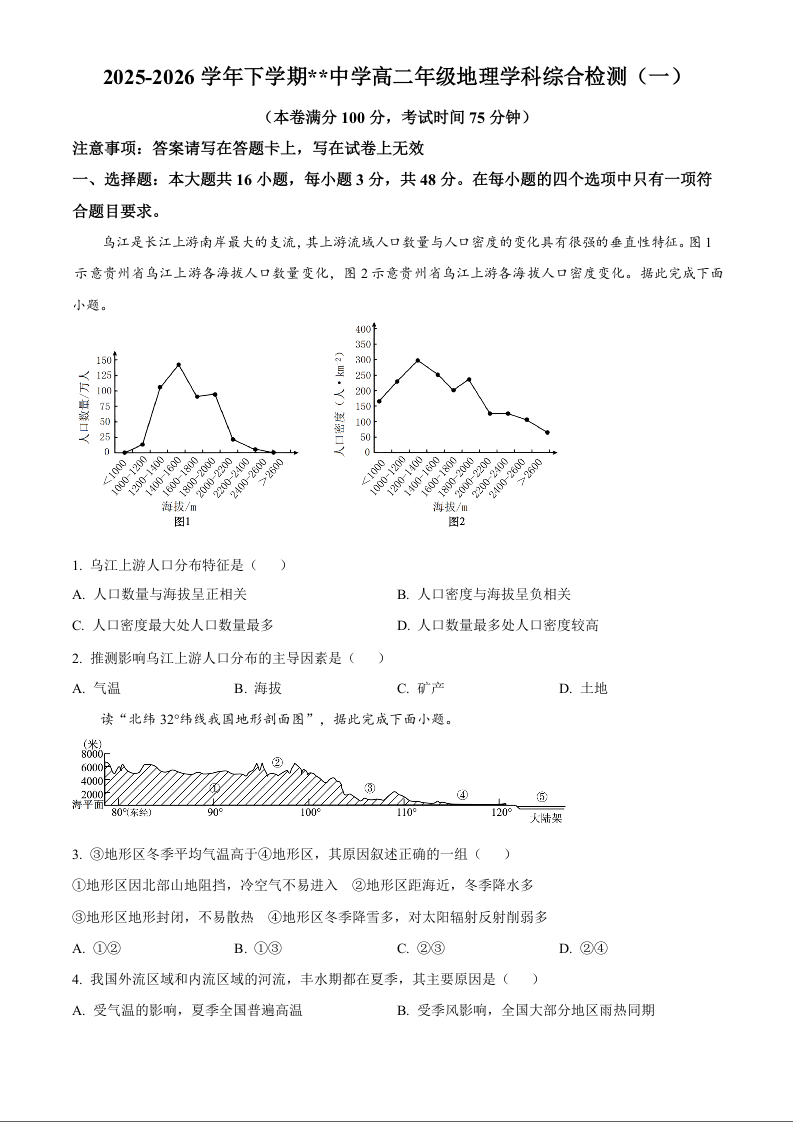 高二地理(原卷版)--江西省赣州市四校2025-2026学年高二下学期综合检测联考(一)