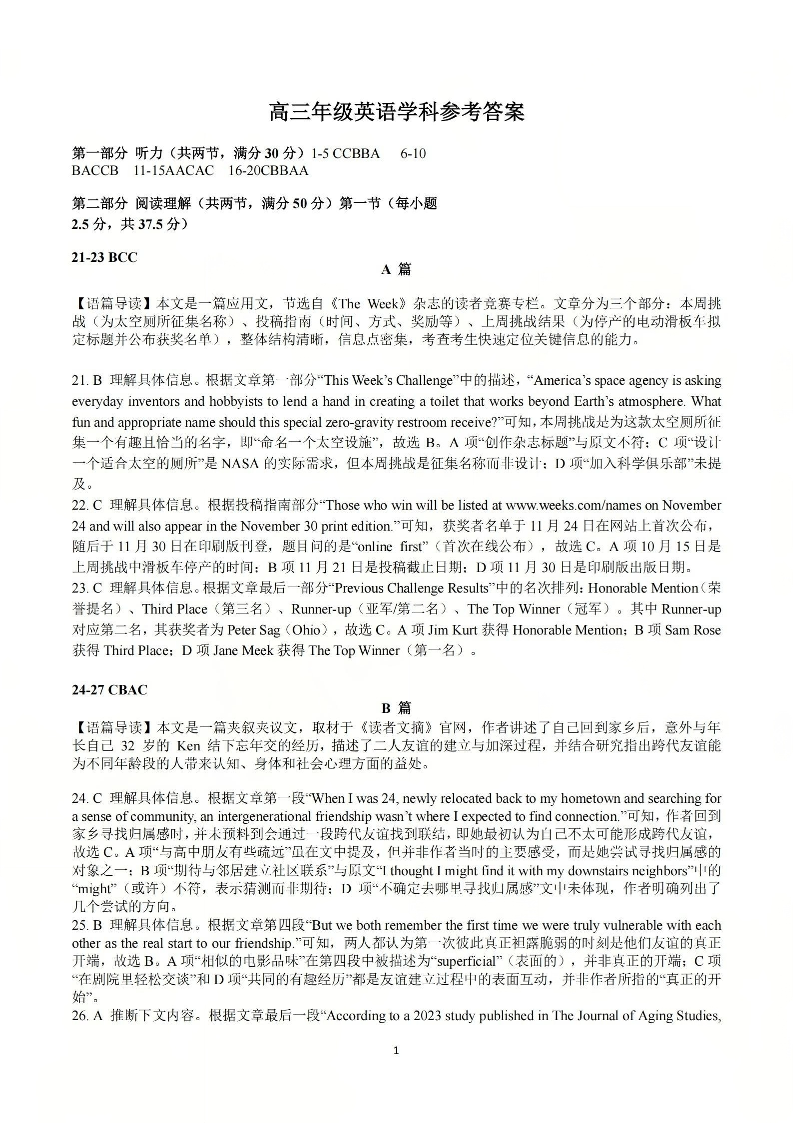 高三英语答案--天域全国名校协作体2026届高三4月联考