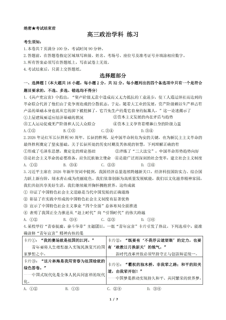 高三政治--天域全国名校协作体2026届高三4月联考