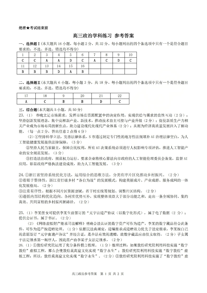 高三政治答案--天域全国名校协作体2026届高三4月联考