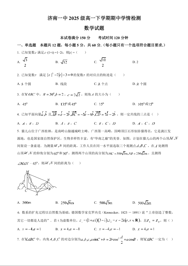 高一数学(原卷版)--山东省济南第一中学2025-2026学年高一下学期期中学情检测
