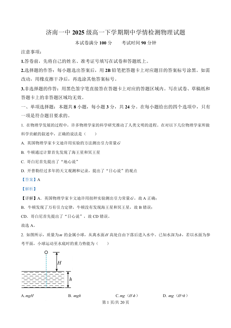 高一物理(精品解析版)--山东省济南第一中学2025-2026学年高一下学期期中学情检测