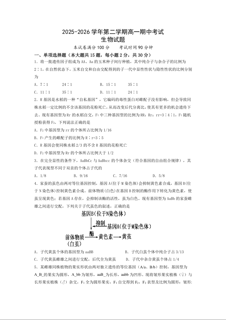 高一生物--山东省济南第一中学2025-2026学年高一下学期期中学情检测