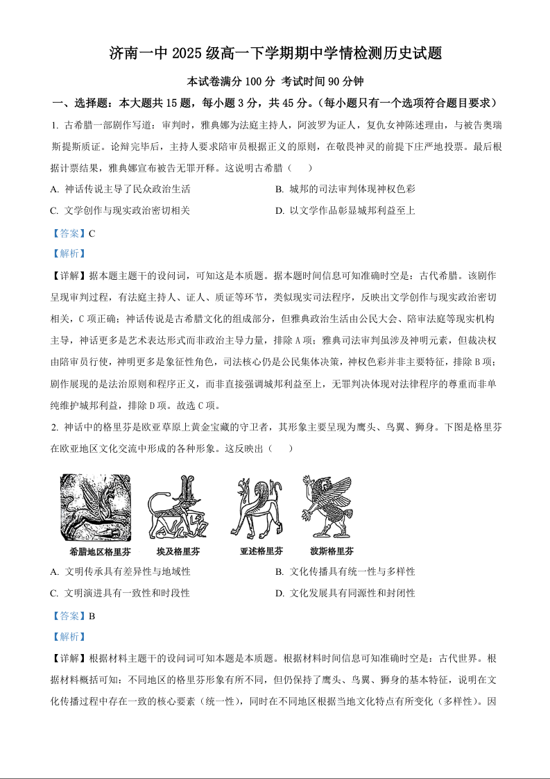 高一历史(解析版)--山东省济南第一中学2025-2026学年高一下学期期中学情检测
