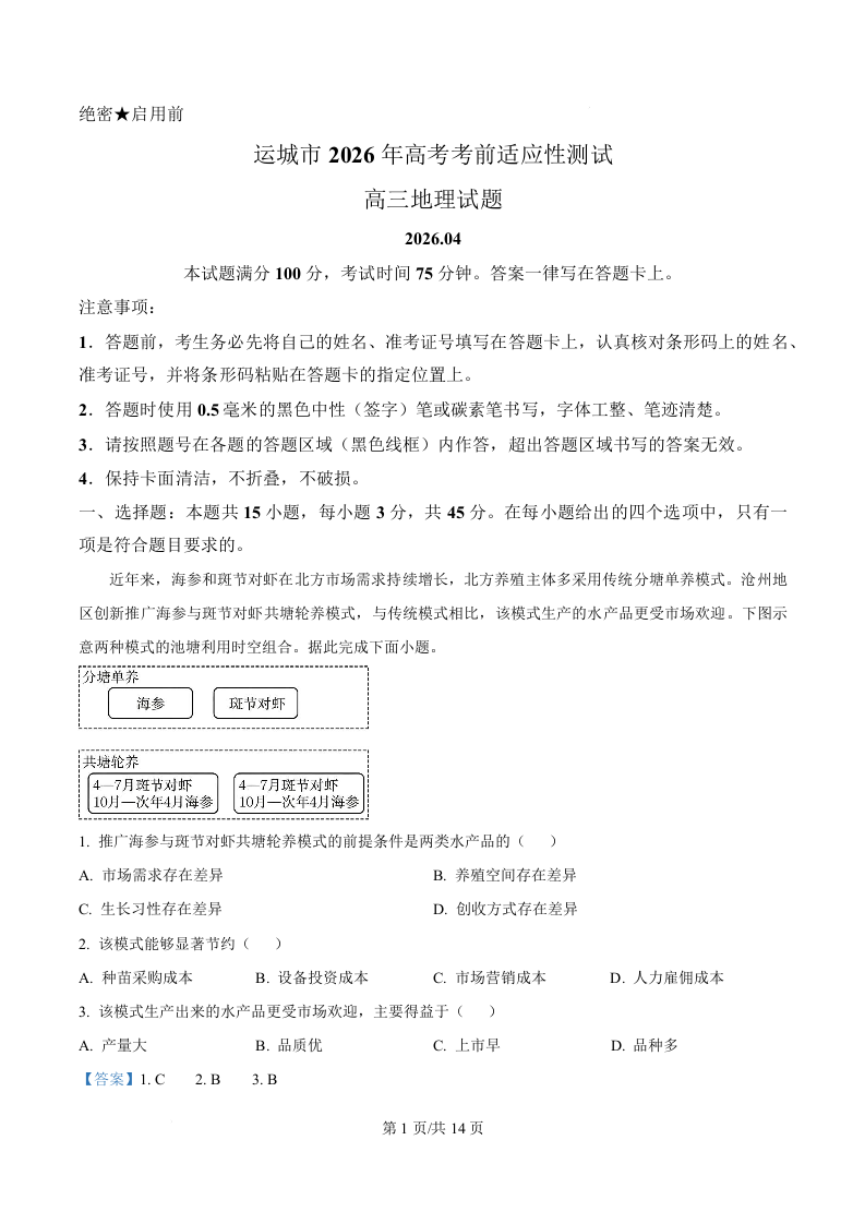高三地理(解析版)--山西省运城市2026 届高三4月高考考前适应性测试