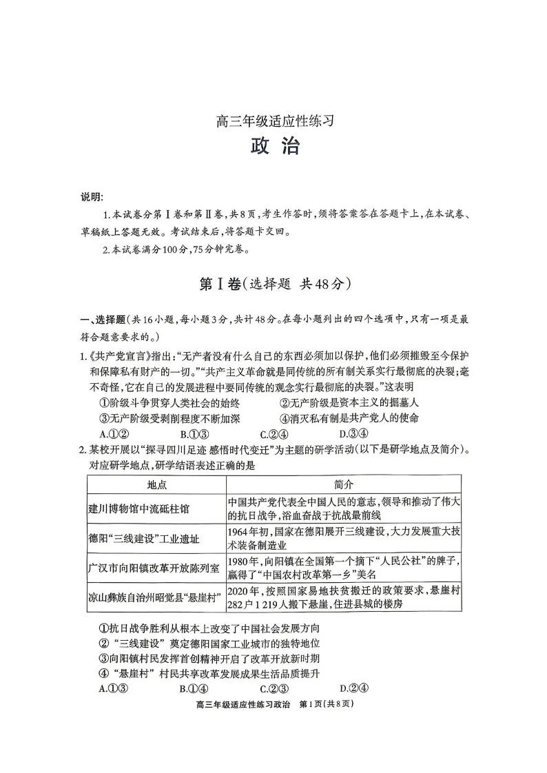 高三政治--四川省德阳市2026届高三年级适应性练习(德阳三诊)